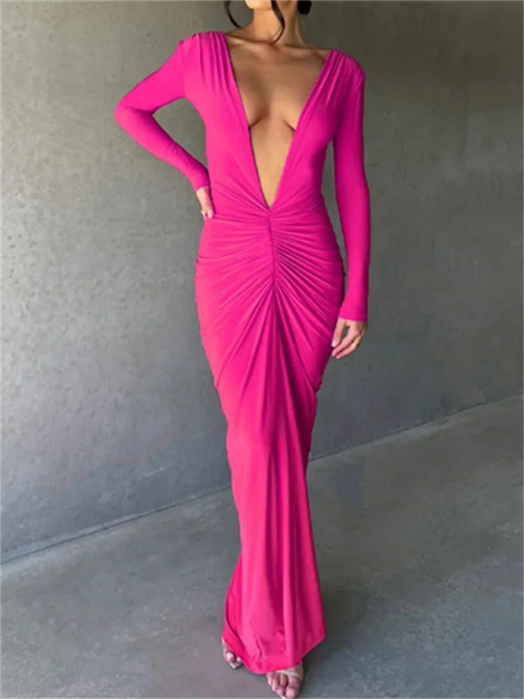 Women Long Bodycon Dress Solid Color Deep V-Neck Ruched Long Sleeve Dress Spring Fall Evening Party Dress